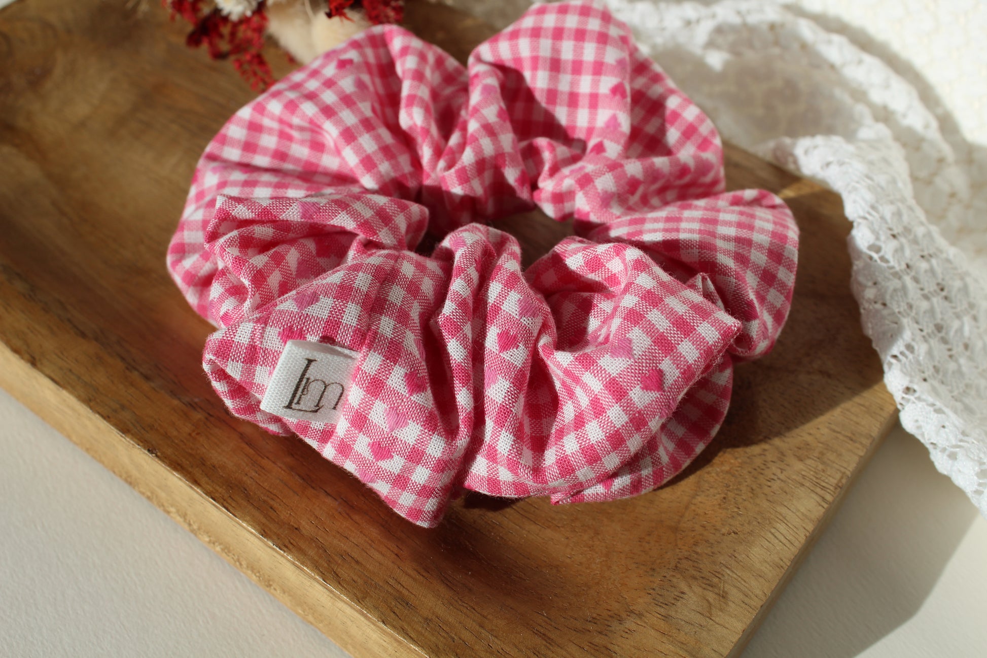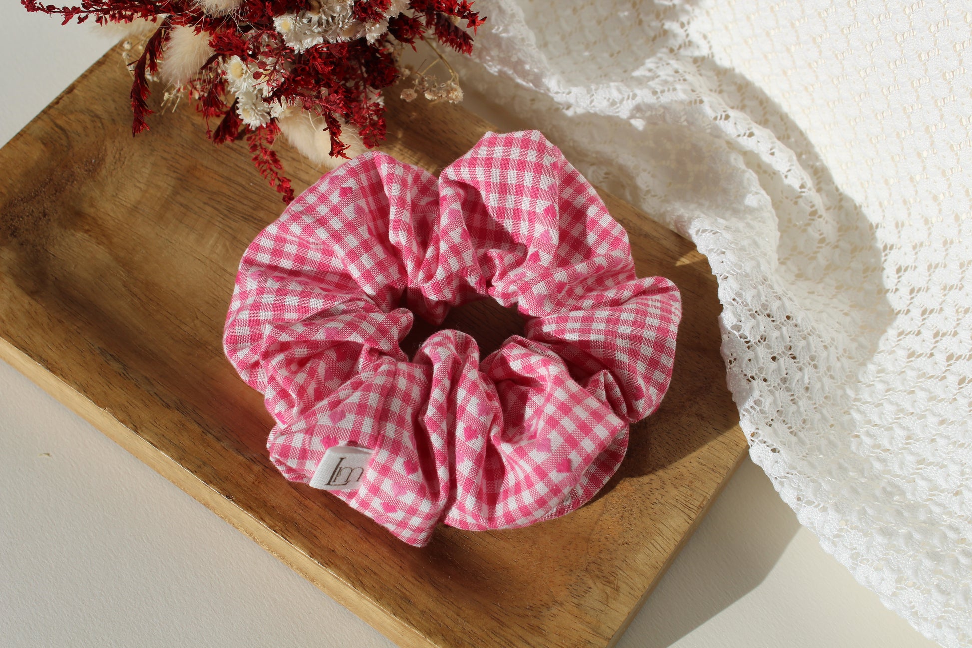 Agathe, le chouchou qui incarne la féminité avec style. Confectionné en vichy rose tendre, cet accessoire capillaire arbore un délicat imprimé de petits cœurs qui ajoutent une touche romantique à chaque coiffure.