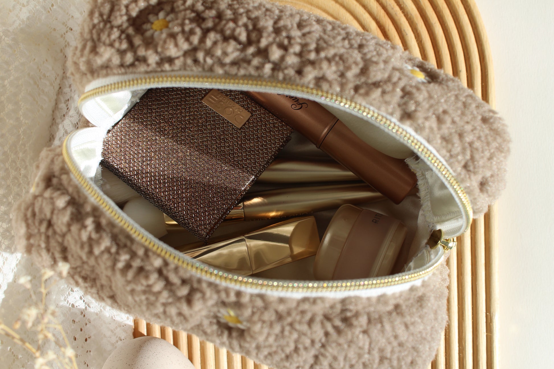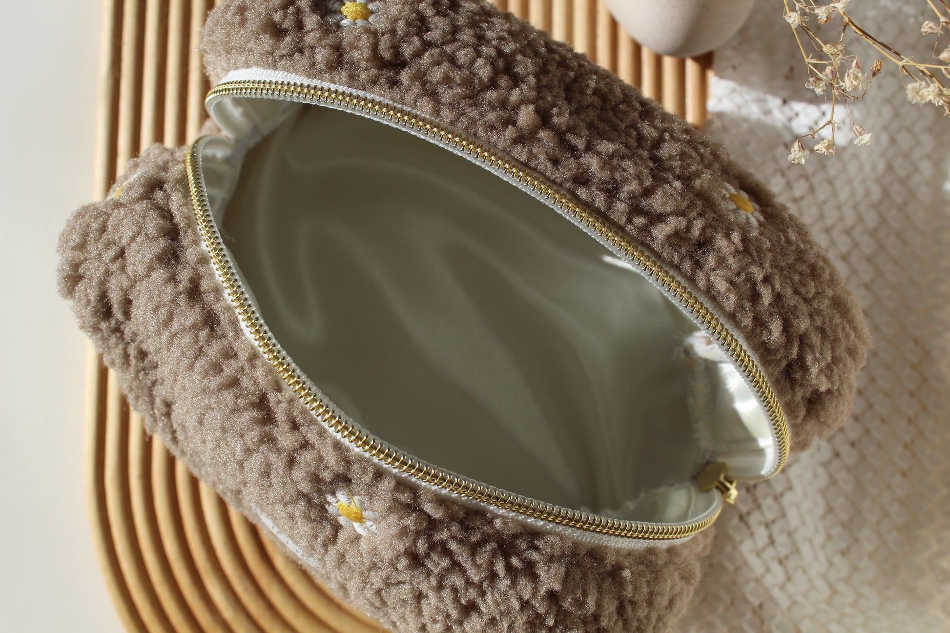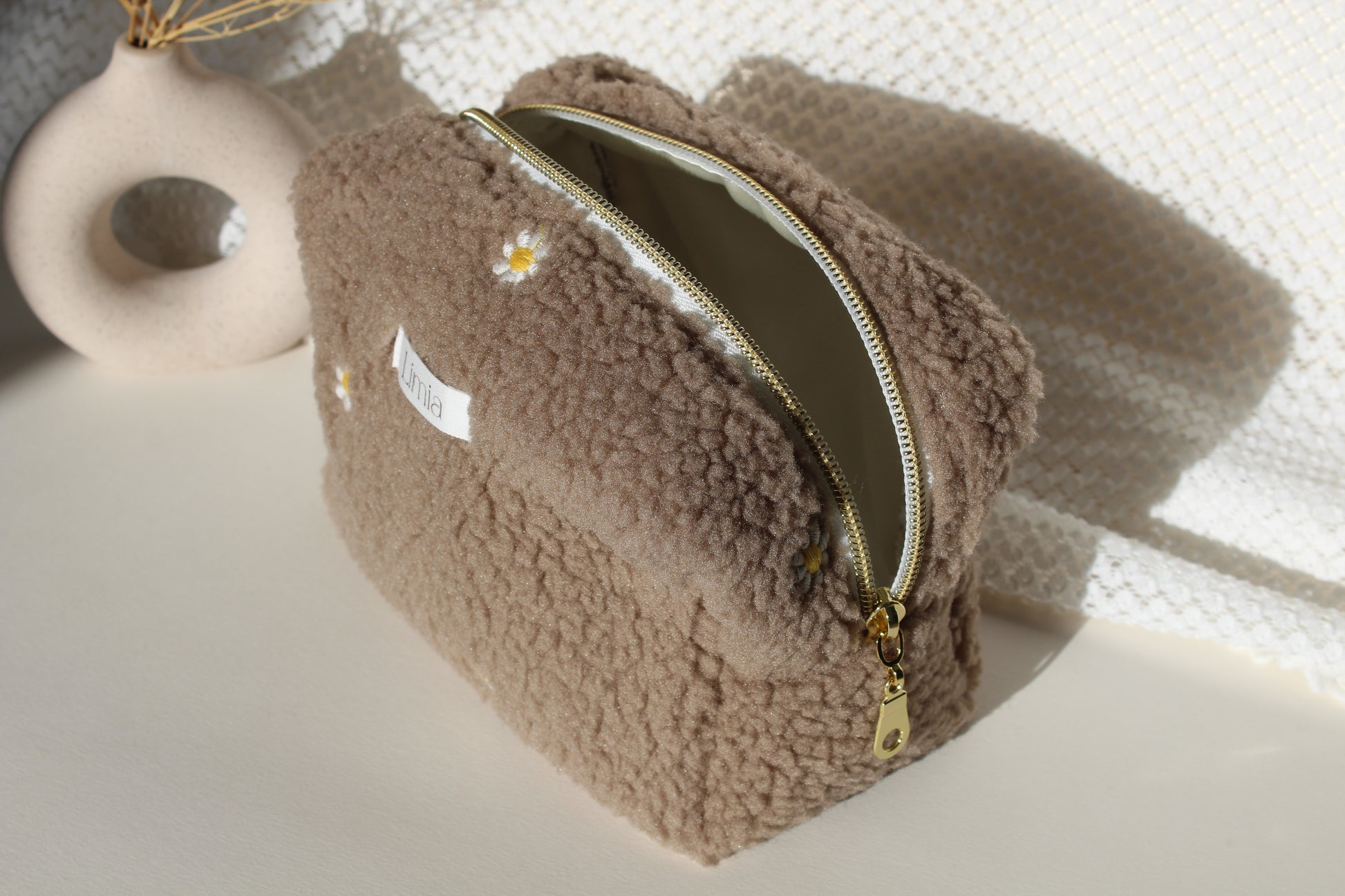 Trousse de toilette Bloom : l'accessoire qui refuse la banalité. Enveloppée de moumoute beige velouté, elle arbore des fleurs blanches brodées avec une précision captivante. Son intérieur satiné écru promet une expérience tactile incomparable à chaque utilisation. Pour les femmes qui exigent que chaque détail reflète leur personnalité affirmée, cette trousse devient bien plus qu'un rangement—c'est une déclaration d'élégance indomptable.