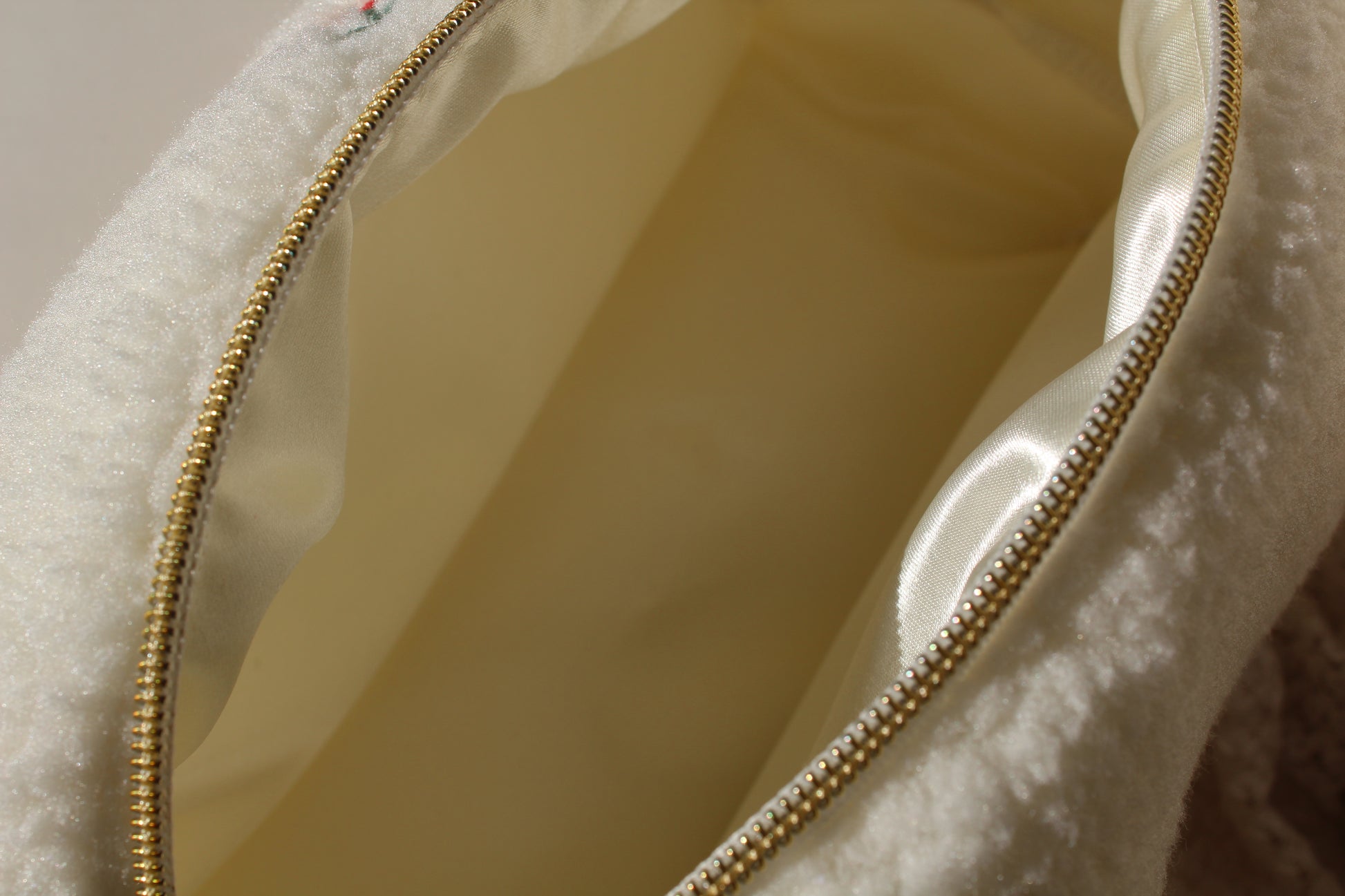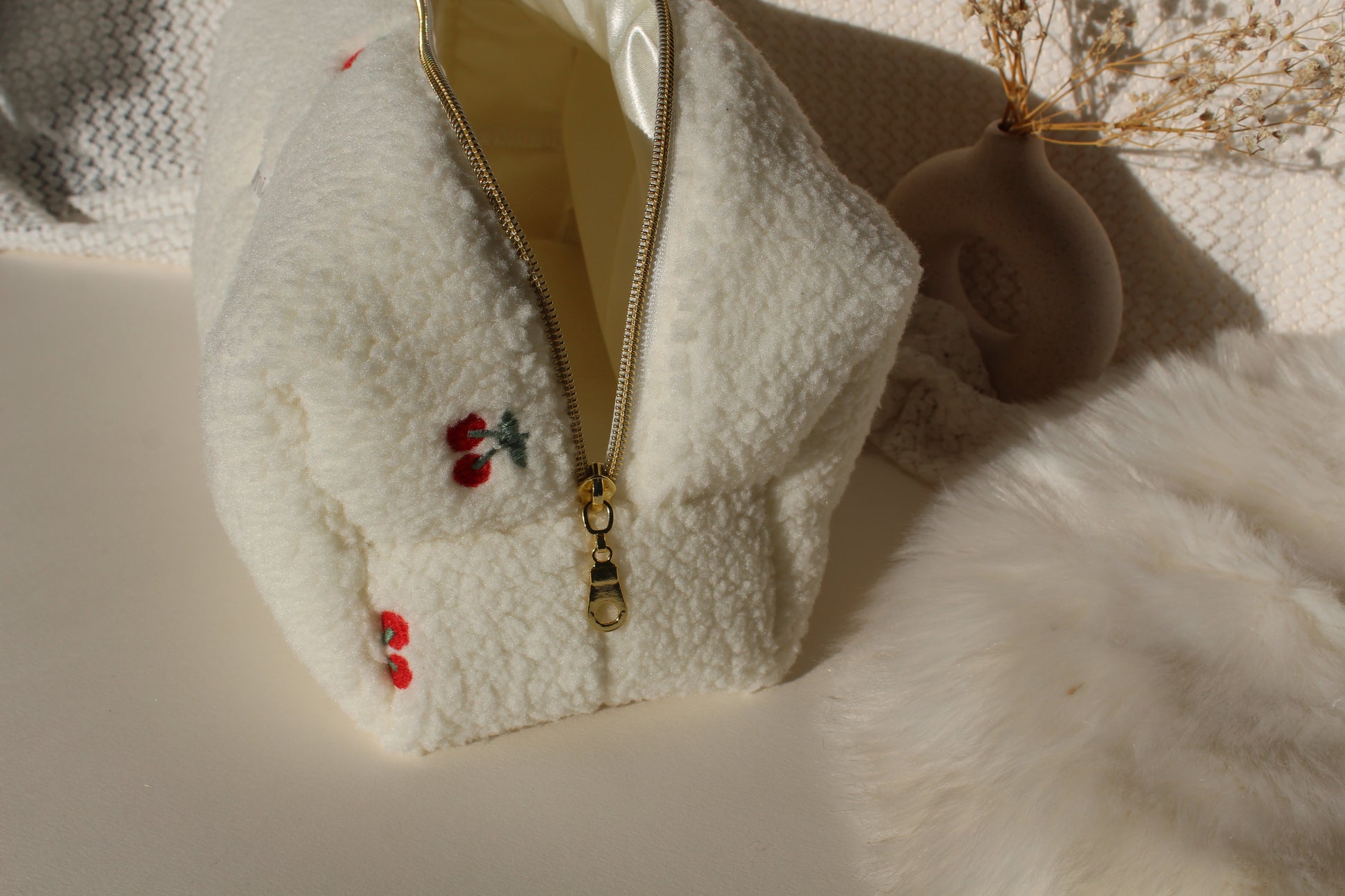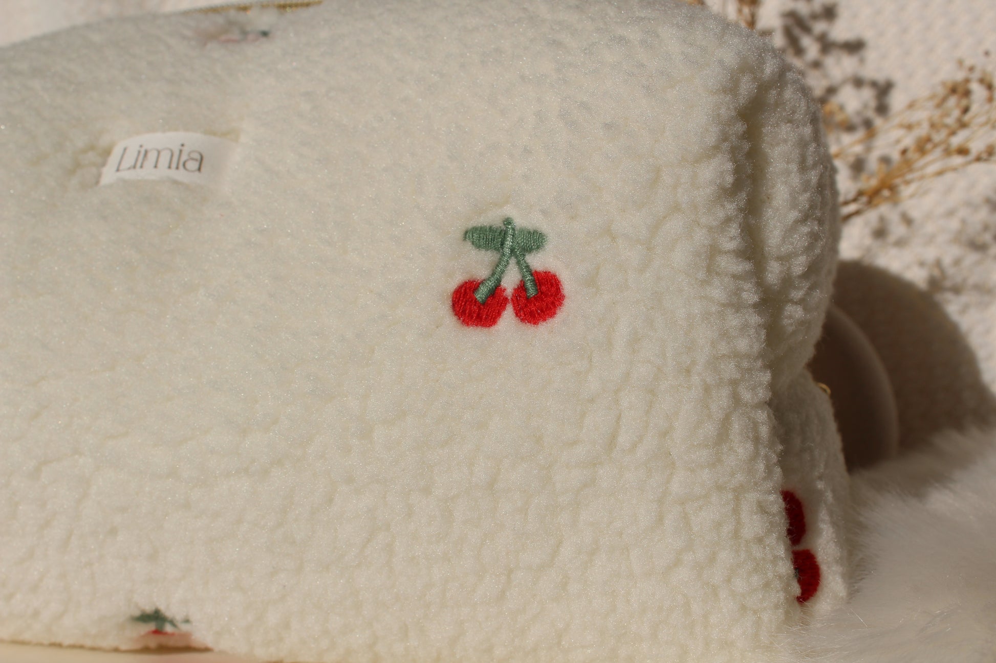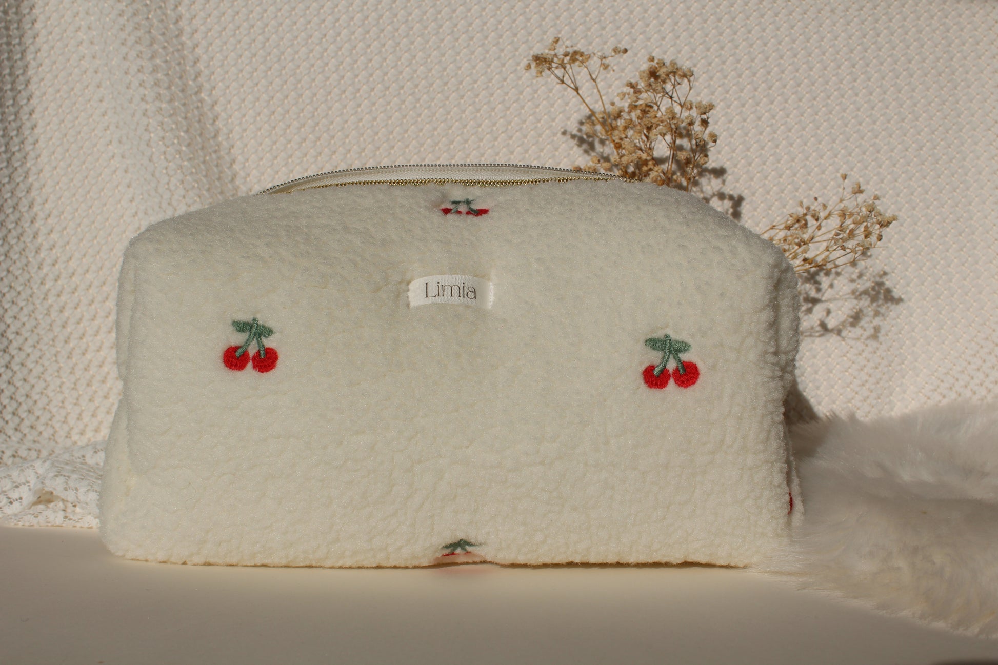 Découvrez Cherry, votre allié indispensable pour organiser vos essentiels avec style. Confectionnée en moumoute ultra-douce, elle séduira par ses cerises brodées délicatement. L'intérieur en satin protège vos produits précieusement tout en offrant un rangement généreux.