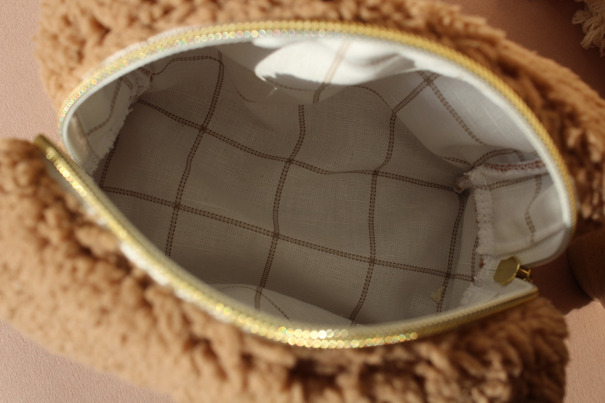 Découvrez la trousse Cinnamon : une alliance audacieuse entre douceur et style. Son extérieur en moumoute marron clair apporte une touche chaleureuse et réconfortante, tandis que son intérieur en coton imprimé carreaux ajoute un contraste surprenant et graphique. Compacte et originale, cette trousse est idéale pour garder vos essentiels avec une touche d’audace au quotidien.