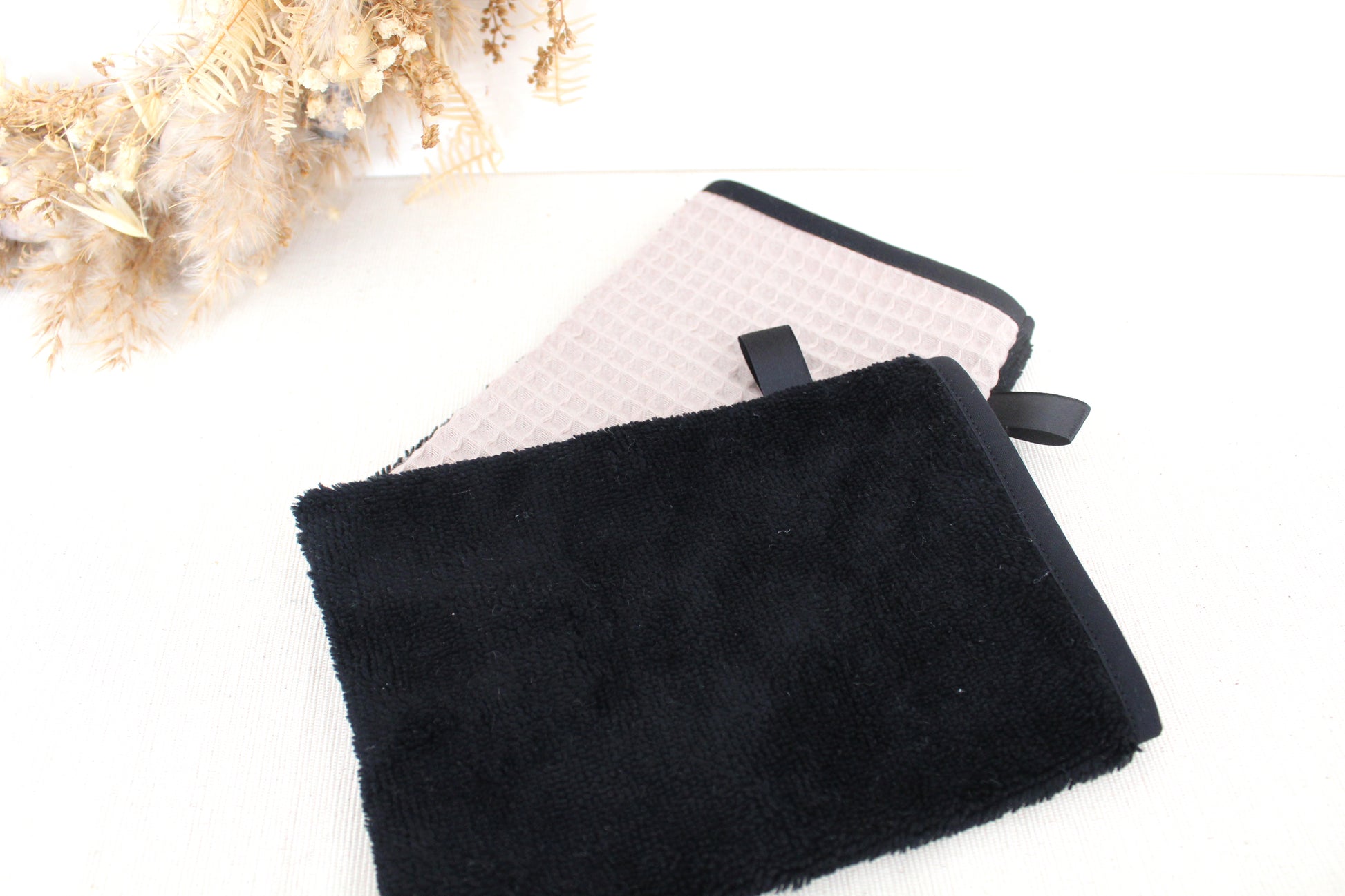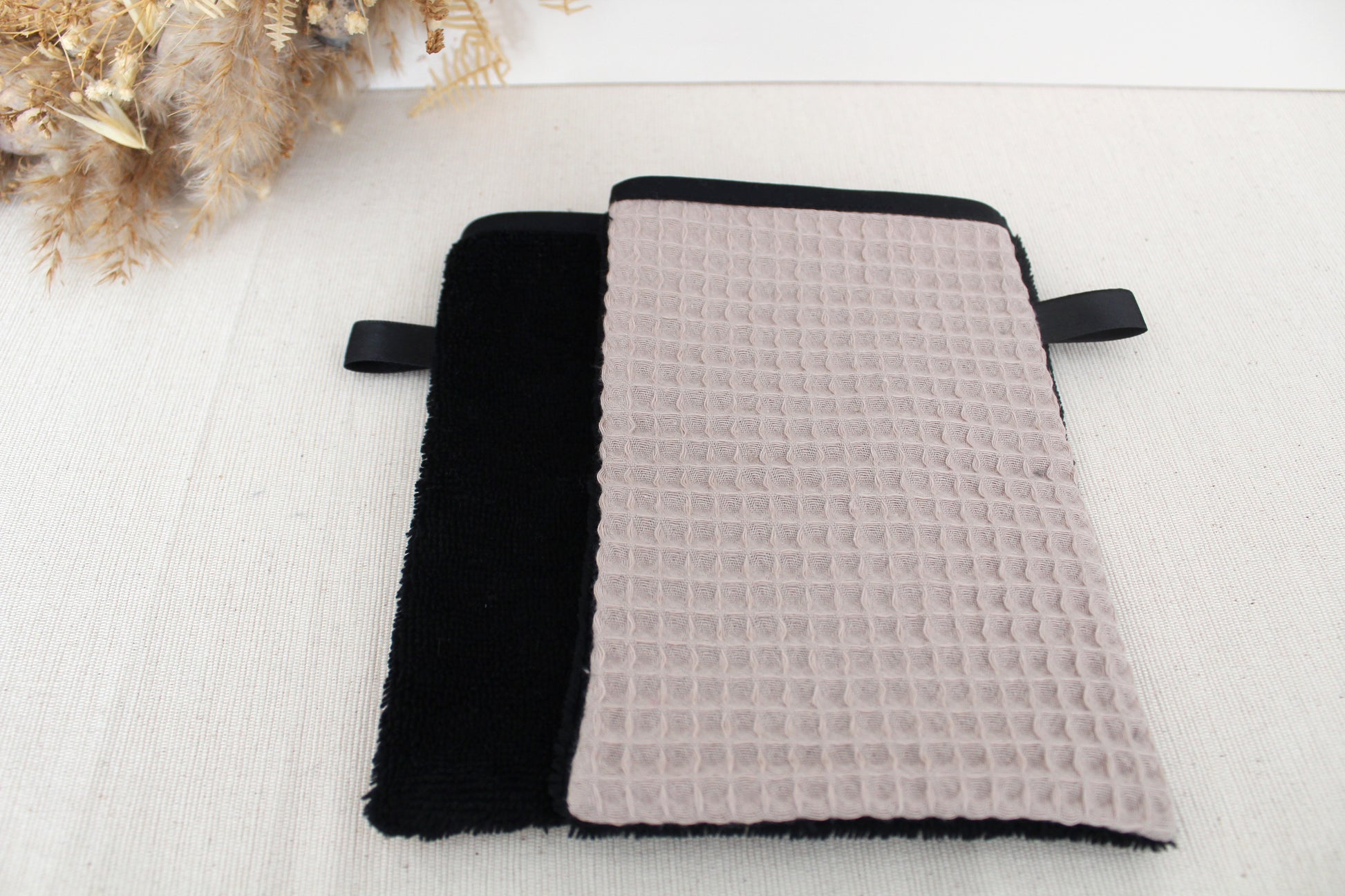 Gant de toilette taille adulte fleuri et en tissu éponge bambou noir 100% coton et certifié Oeko-Tex pour une face, et un tissu éponge nid d'abeille beige sur l'autre face.